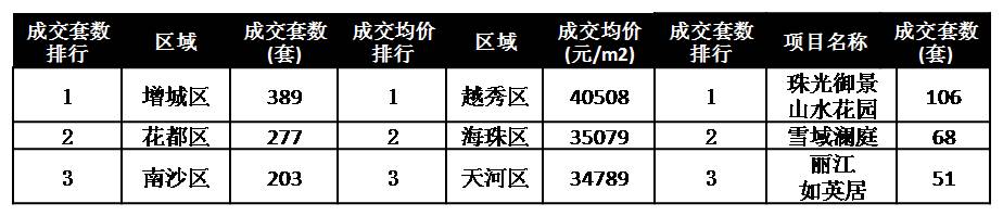 区域成交均价排行方面,越秀、海珠、天河依旧包揽前三甲,越秀区东风广场、东海嘉园成交价均超过50000元/㎡。海珠区佳滨苑签约均价超过30000元/㎡,7套成交量位居海珠区榜首。天河区成交量冠军为上城阳光花园,成交均价接近24000元/㎡,其次,凯旋新世界以接近75000元/㎡的签约均价位居天河区首位。