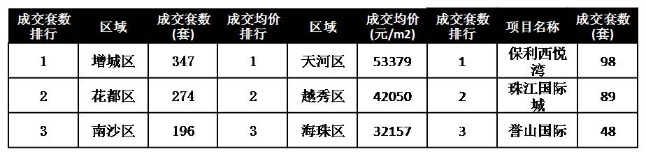 项目成交套数排行方面,保利西悦湾上周集中签约,以98套居首。亚军为从化区域大盘珠江壹城(珠江国际城),因2015年底加推C1区,年后签约放量,上周以89套位列第二。增城誉山国际年前推出89号楼,年后持续签约,其中上周签约48套,排名第三。