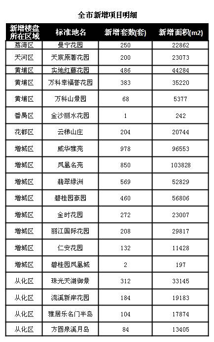 外围区新货总量超过五千套,占全市新增货量92%。其中增城区以3471套新货雄踞榜首,成为全市的供应大户。黄埔区以937套新货位居第二,长岭居两盘均有斩获,实地红藤花园、万科山景园分别新增486套、68套。