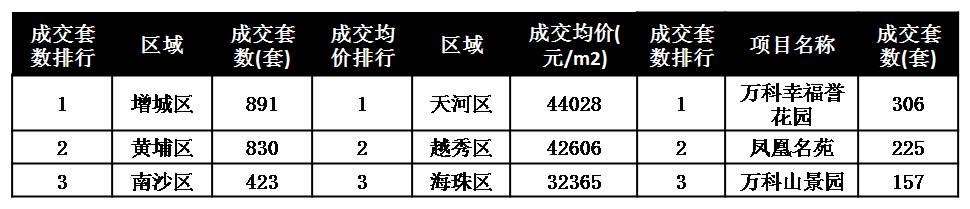 项目成交套数排行方面,万科两盘齐头并进,同位于黄埔区的万科幸福誉花园、万科山景园分别以306套、157套网签占据第一、第三,增城区凤凰名苑(碧桂园凤凰城)则以225套位居第二。