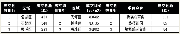 项目成交套数排行方面,番禺区祈福名家阁成交111套位居第一,其次是花都区热橙花园69套;增城区敏捷绿湖首府54套。