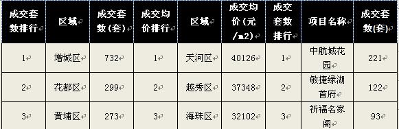 成交均价排行方面,天河区汇悦台、嘉裕花园等豪宅项目均有签约,区域均价稳居“4字头”(40126元/㎡),保持全市第一的位置。越秀、海珠两区成交基数小,分别以均价37348元/㎡、32102元/m2排在二、三。