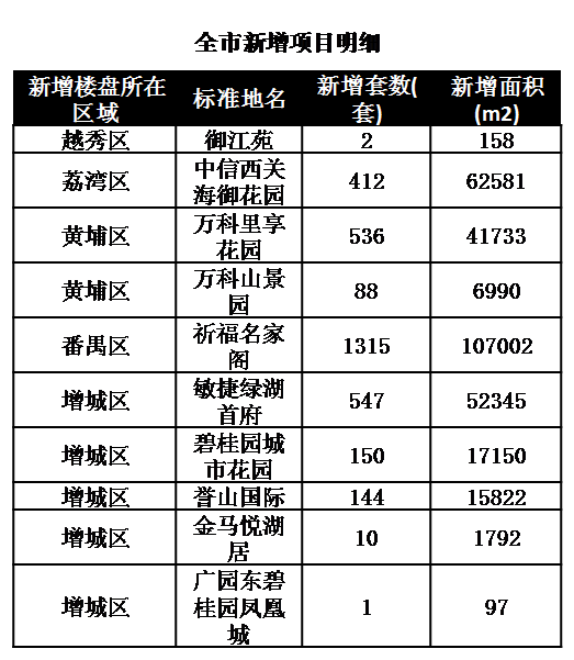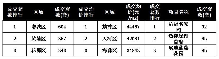 从区域上看,增城、黄埔、花都包揽三甲。增城区以604套雄踞榜首,区域内敏捷绿湖首府、金地香山湖花园等项目持续热销;黄埔区成交357套稳居第二,预计在新地王的带动下,区域将继续放量;花都区则以343套成交排在第三。
