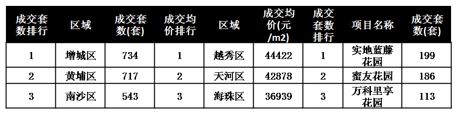 区域成交均价排行方面,越秀区长期处于缺货状态,其价格一直处于全市高位,上周以均价44422元/㎡再夺冠;天河区虽有珠江新城豪宅支撑,但受奥体、东圃等板块的刚需项目拖累而拉低均价,最终以1544元/㎡的差距败给越秀区,排名第二;海珠区则以36939元/㎡排名第三。