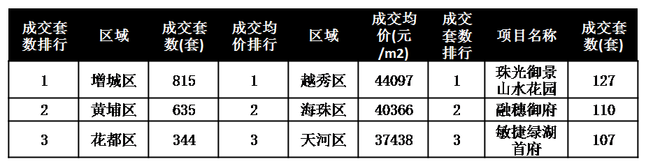 区域成交均价排行方面,越秀区东山印象台借助一二手联动强销后,上周集中网签,助力全区以44097元/㎡;海珠区则在保利天悦、天誉半岛花园江景豪宅的支撑下,以40366元/㎡夺得亚军;天河区网签以刚需项目兰亭盛荟萃、天宸原著花园、远洋天骄花园为主,最终不敌海珠区,以37438元/㎡屈居季军。