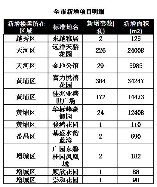 据中地行不完全统计,上周1个项目开盘、3个项目加推、3个项目全新登记。开盘的项目是富力悦禧花园。加推的项目是葛洲坝保利曼城、新福港鼎峰、远洋天骄。亚运城、金地天河公馆、同创誉城则全新登记。