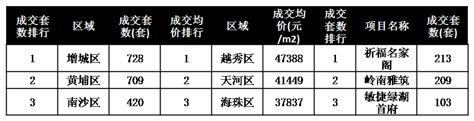 区域成交均价排行方面,越秀区东山印象台经过一二手联动强销后,上周持续网签,拉动全区以47388元/㎡夺得冠军。天河区虽有珠江新城等豪宅板块的支撑,但区域网签仍以刚需项目占比较大,上周受上城阳光花园(天健上城)加推后集中网签影响,全区以41449元/㎡排名第二。海珠区则以37837元/㎡排名第三。
