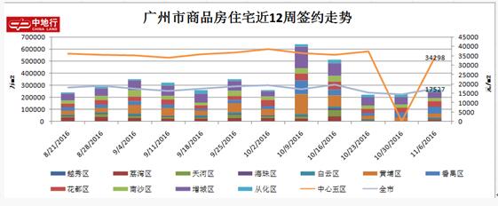 据中地行市场研究部监控阳光家缘数据显示,上周(2016.10.31-2016.11.06)广州市商品房住宅共成交2360套,累计26.502万m2,均价17527元/m2,环比增长:13.46%、 14.38%、21.14%。