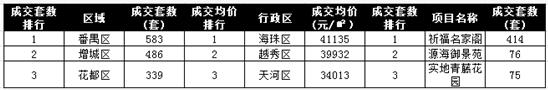 项目排行榜中番禺区祈福名家阁以414套遥遥领先于第二名源海御景苑的76套,第三名则是黄埔区的实地常春藤,其最终成交数是75套。
