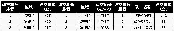 项目排行方面,花都区热橙花园以142套位居第一;增城区的源海御景苑以88套位列第二,黄埔区的万科山景园以86套微弱只差位列第三。