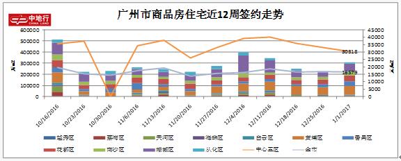 据中地行市场研究部监控阳光家缘数据显示,上周(2016.12.26-2017.01.01)广州市商品房住宅共成交2875套,累计30.964万m2,均价16579元/m2,环比增长:38.09%、35.50%、-2.07%,年底开发商冲刺,多盘推售,所以成交量有显著上涨,价格则维持稳定。