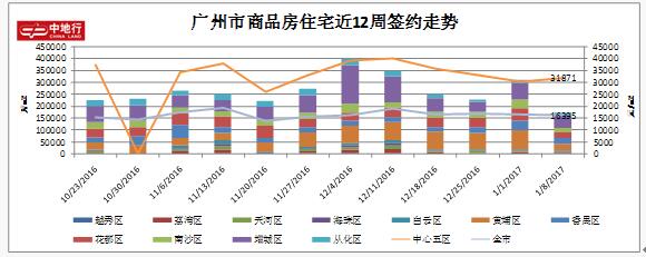 据中地行市场研究部监控阳光家缘数据显示,上周(2017.01.02-2017.01.08)广州市商品房住宅共成交1610套,累计17.41万m2,均价16395元/m2,分别下降:-44.00% 、-43.77%、 -1.11%。