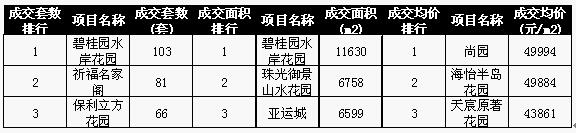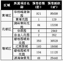 项目排行方面,增城区两盘上榜,碧桂园水岸花园、保利立方花园分别以103套、66套排在第一、第三位。番禺区的祈福名家阁以81套位居第二。