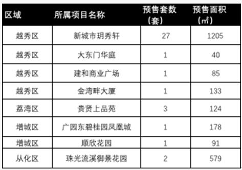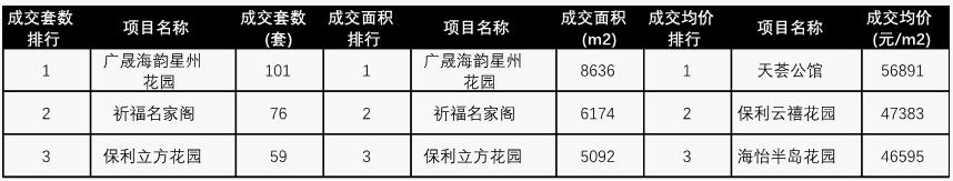 项目排行方面,南沙区的阳光城丽景湾、番禺区的祈福缤纷汇以及增城区的保利i立方分别占据前三位。其成交套数分别为101套、76套和59套。