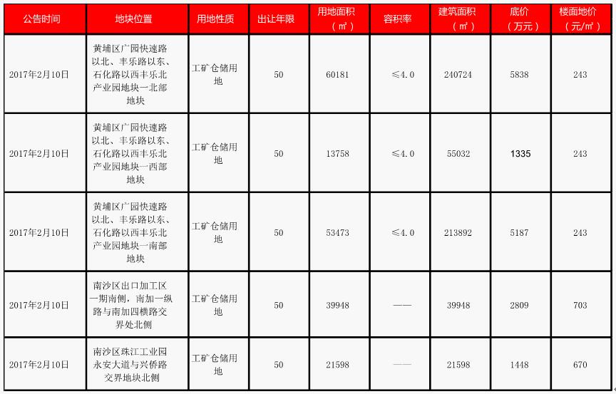 上周挂牌土地中,有3块位于黄埔区,分别位于:黄埔区广园快速路以北、丰乐路以东、石化路以西丰乐北产业园地块一北部地块、黄埔区广园快速路以北、丰乐路以东、石化路以西丰乐北产业园地块一西部地块以及黄埔区广园快速路以北、丰乐路以东、石化路以西丰乐北产业园地块一南部地块。另外2块位于南沙区,分别位于南沙区出口加工区一期南侧,南加一纵路与南加四横路交界处北侧以及沙区珠江工业园永安大道与兴侨路交界地块北侧。