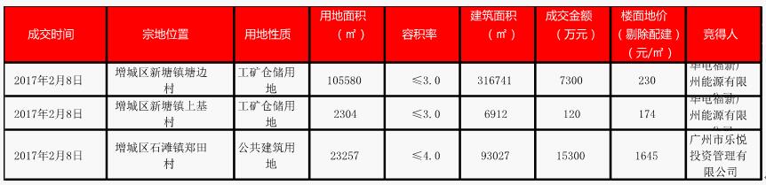 成交方面,共3块土地成交,其中2宗为工矿仓储用地,均位于增城区新塘镇,1宗为公共建筑用地,位于增城区石滩镇郑田村。