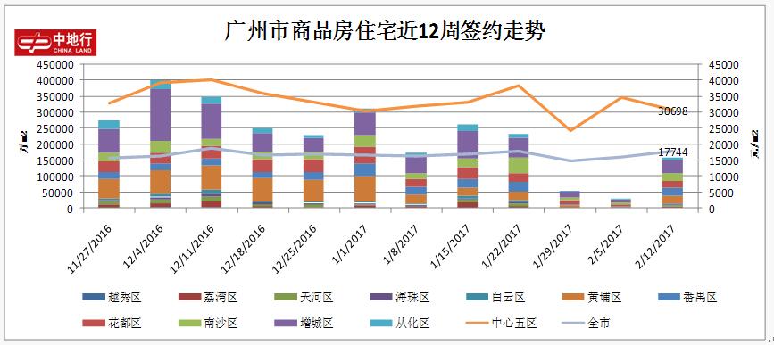 据中地行市场研究部监控阳光家缘数据显示,上周(2017.02.06-2017.02.12)广州市商品房住宅共成交1468套,累计15.798万m2,均价17744元/m2,环比增长:418.73% ,441.61% ,10.43%。