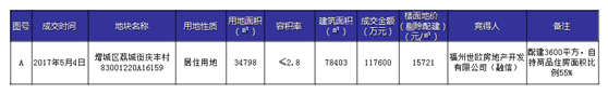 上周广州土场市场成交1宗宅地,该地块位于增城区荔城街,用地面积共34798㎡,总建筑面积为78403㎡,最终被福州世欧房地产开发有限公司(即融信集团) 以11.76亿和自持55%的面积竞得。