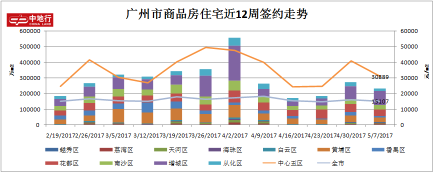 据中地行市场研究部监控阳光家缘,上周(2017.05.01-2017.05.07)广州市商品房住宅共成交2108套,累计23.111万㎡,较前一周下跌了13.68%、 15.79%,成交量经过“五一”假期的小冲锋后有所回落。
