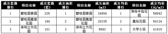 项目排行方面,增城区项目包揽成交量前三名,碧桂园豪园共成交225套排名第一;碧桂园嘉誉花园成交184套获得第二;保利i立方花园则以101套成交夺得第三。
