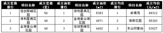 项目排行方面,佳创紫峰花园(时代长岛)共成交54套排名第一;保利星满花园(保利星海小镇)成交48套获得第二;金地香山湖花园则以46套成交夺得第三。