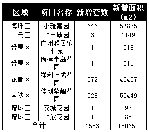 据中地行监控阳光家缘,上周(2017.05.15-2017.05.21)全市增加共1553套,新增总面积为150650㎡。其中中心区域,海珠广纸板块的小雅嘉园(雅居乐海珠小雅)新增646套货量;外围区域,南沙区的佳创紫峰花园(时代长岛)和花都区的祥利上成花园分别获得528套和372套。