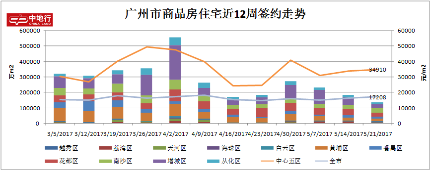 据中地行市场研究部监控阳光家缘,上周(2017.05.15-2017.05.21)广州市商品房住宅共成交1159套,累计13.547万㎡,较前一周下跌了29.93%、 26.59%,成交量自“五一”假期后持续回落。