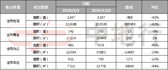 据中地行市场研究部监控阳光家缘数据显示,上周(4.29-5.5)广州市商品房网签2502套,环比前一周(3873套)下降35%;其中住宅共网签1247套,环比前一周(2147套)下降42%;商业共网签242套,环比前一周(265套)下降9%;办公共网签401套,环比前一周(678套)下降41%;车位共网签612套,环比前一周(783套)下降22%。